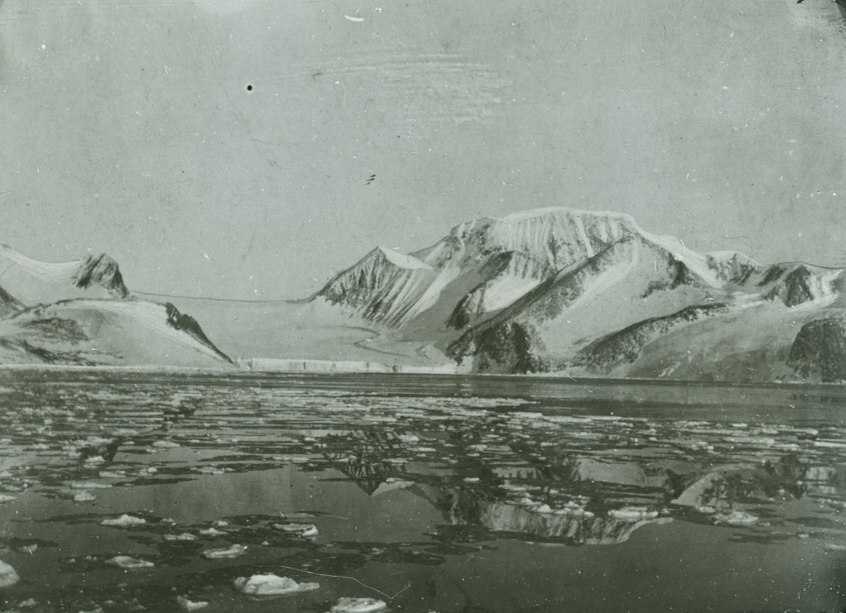 Fotografi med motiv av snötäckta berg och istäckt hav.