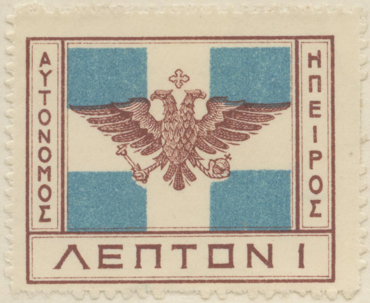 Titel: Frimärke ur Gösta Bodmans filatelistiska motivsamling, påbörjad 1950. Frimärke från Epirus, 1914. Motiv av Epirus Vapen