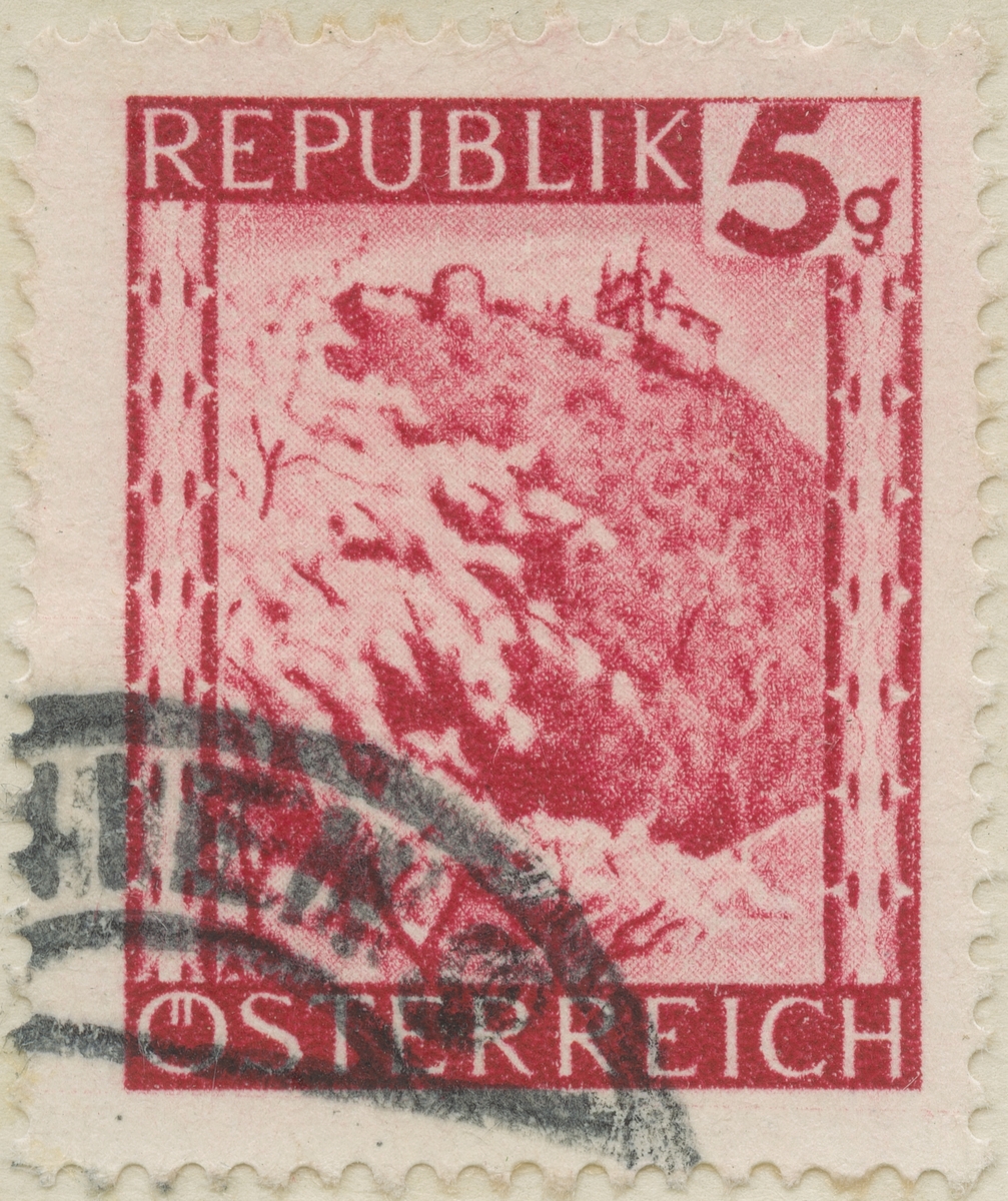 Frimärke från Österrike, 1945. Motiv av Leopoldsberg Kyrka nära Wien