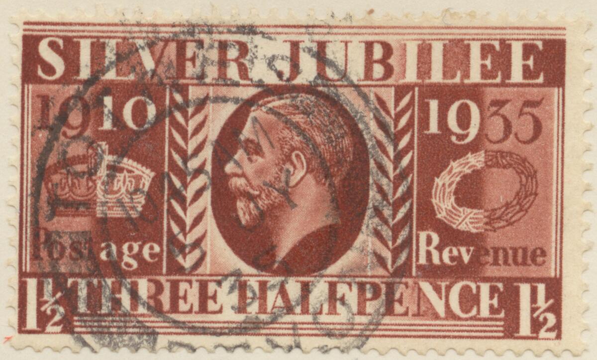 Frimärke från England, 1935. Motiv av Krona symbol Silverjubileum (mitten): Kung George V -Minne av kungens 25-årsregerings jubileum: 1910-1935-