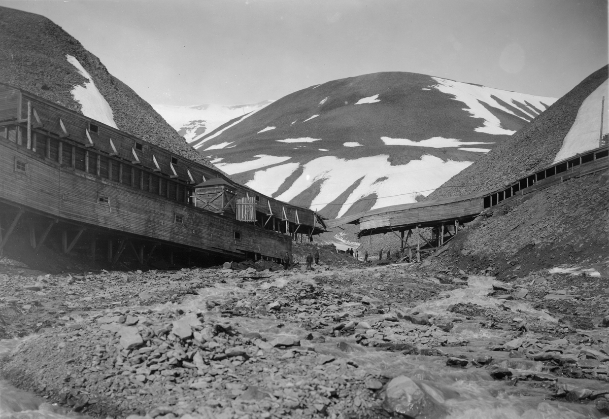 Sveagruva. Uppdämt smältvatten från gruvdalen som raserat gruvgalleriet.