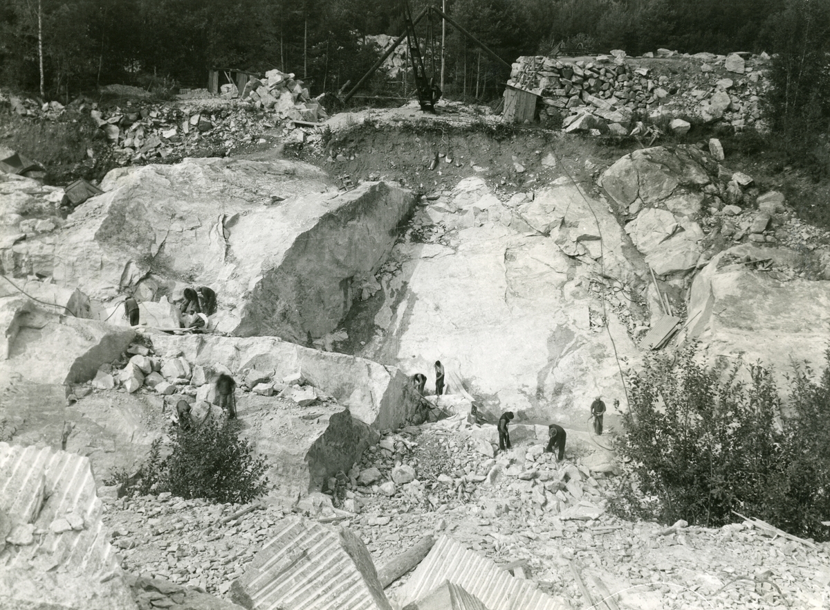 Gropptorps Marmor AB. Brottet i Gropptorp. I förgrunden syns några marmorklossar, som lösbrutits ur berget medelst kanalström.