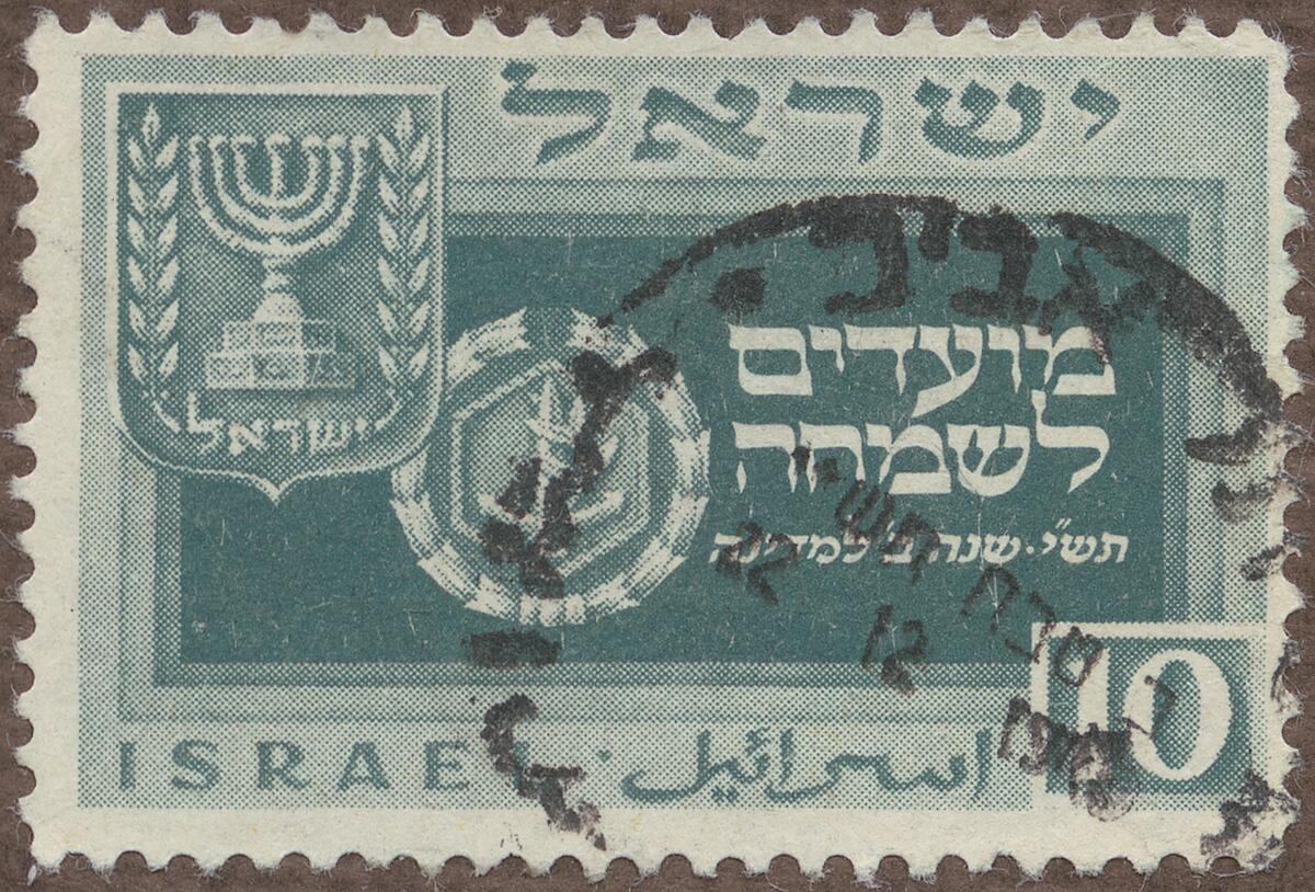 Frimärke från Israel, 1952. Motiv av (t.v) Sjuarmad ljusastake: s.k. "Menorah" (t.h.) emblem: Israels flotta. -Nyårsmärke ( år 5710) och helgdagar.-