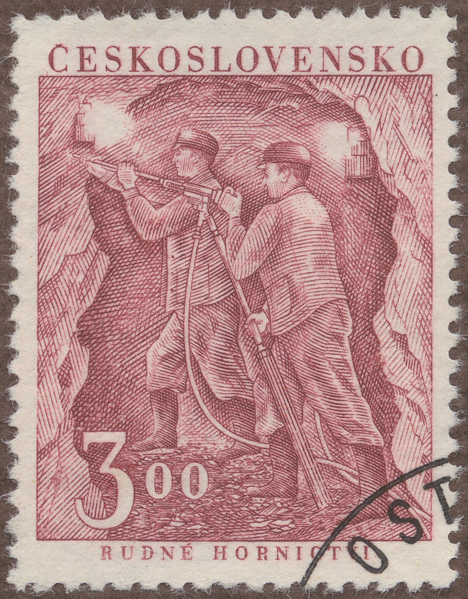 Frimärke från Tjeckoslovakien, 1951. Motiv av Borrning i kolgruva -Propaganda: Gruvarbetarnas Dag: 9 september 1951-
