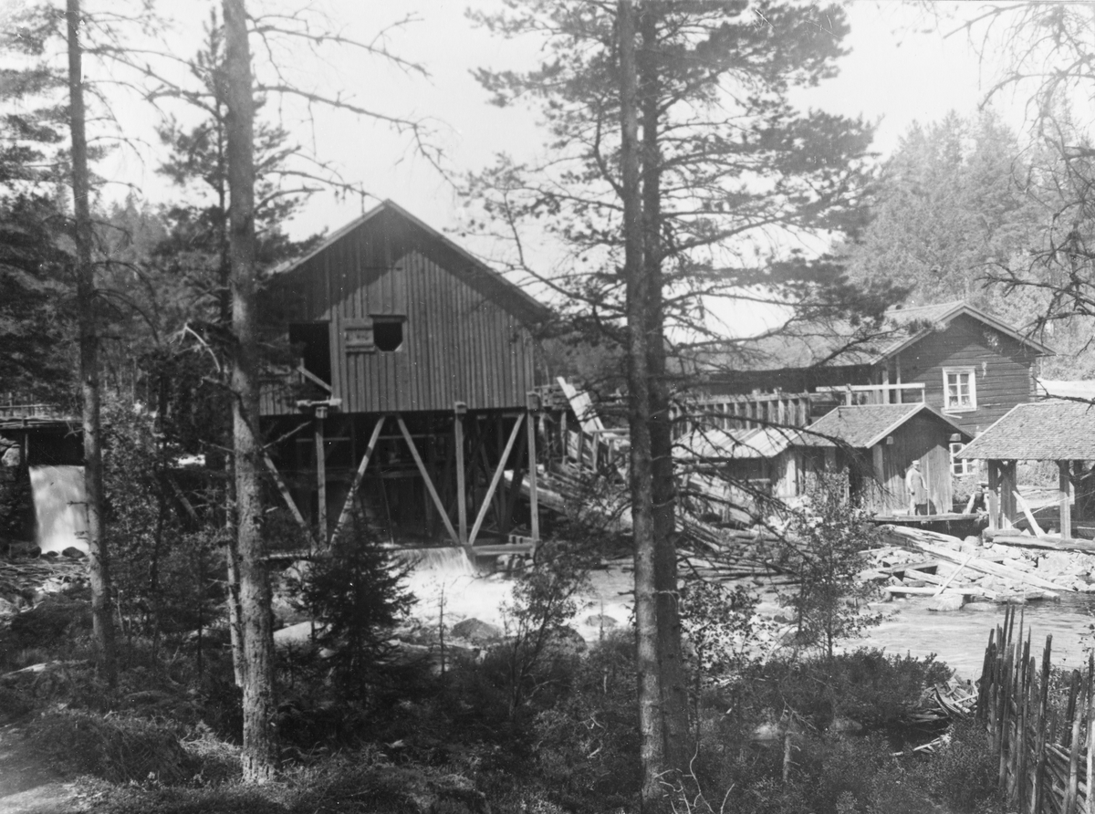 Gustavsfors Bruk. Sågen till vänster, kvarnen till höger. Takspånhyvel till höger i förgrunden. Där ovanför stångjärnssmedjan i Musån, från sjön Knon.