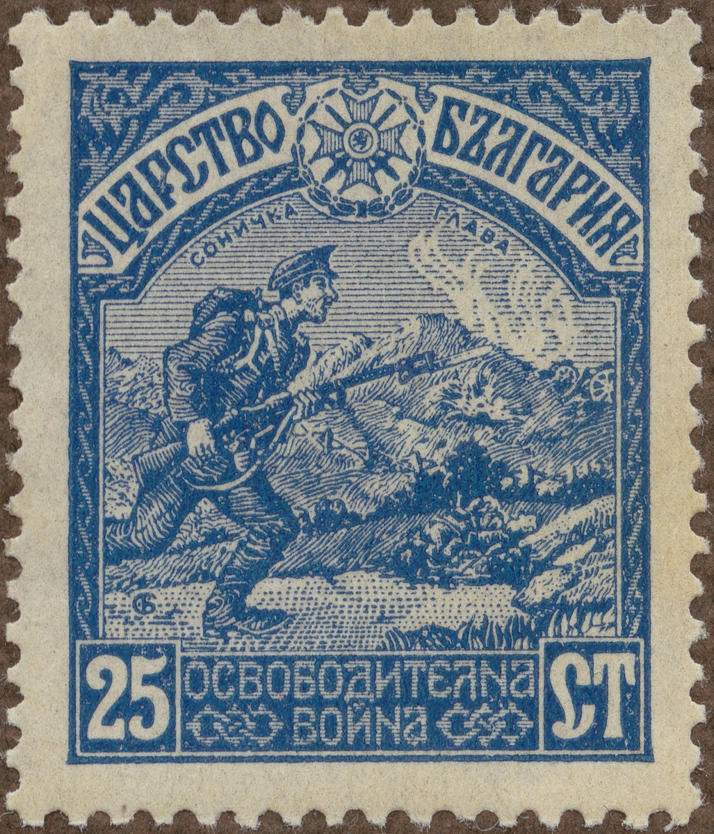 Frimärke från Bulgarien, 1917. Motiv av Infanterianfall: Mont Sonichka -Minne av Macedoniens frigörelse-