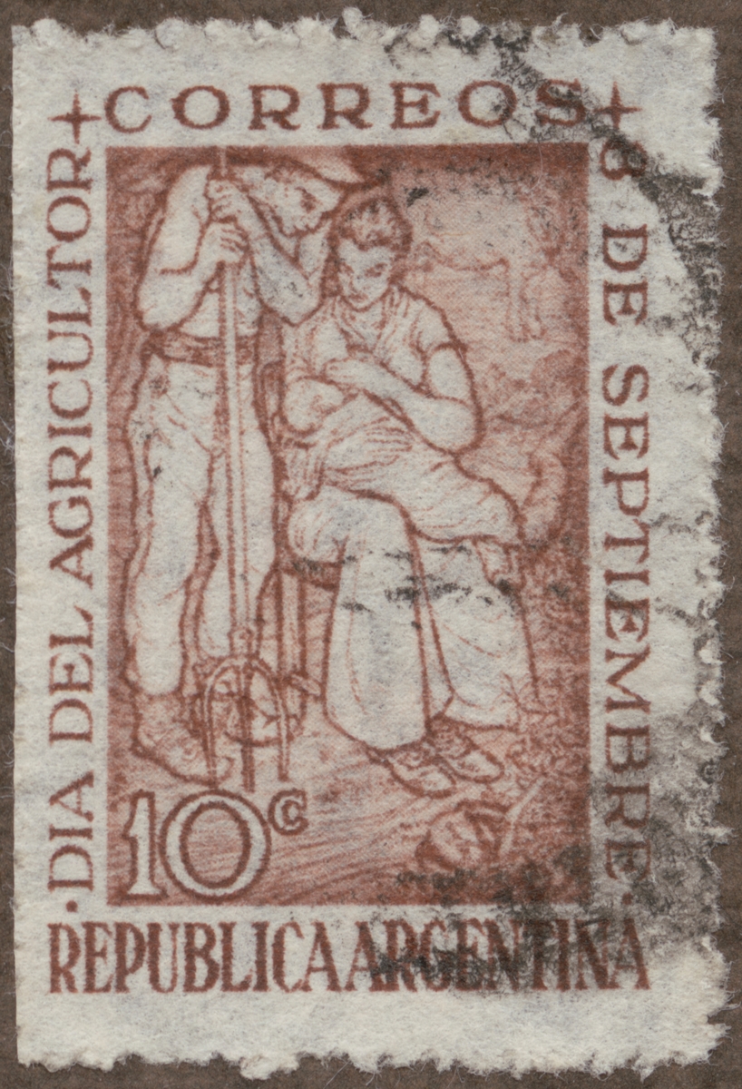 Frimärke från Argentina, 1948. Motiv av Jordbrukarfamilj i Argentina Jordbrukets dag 8 sept 1948