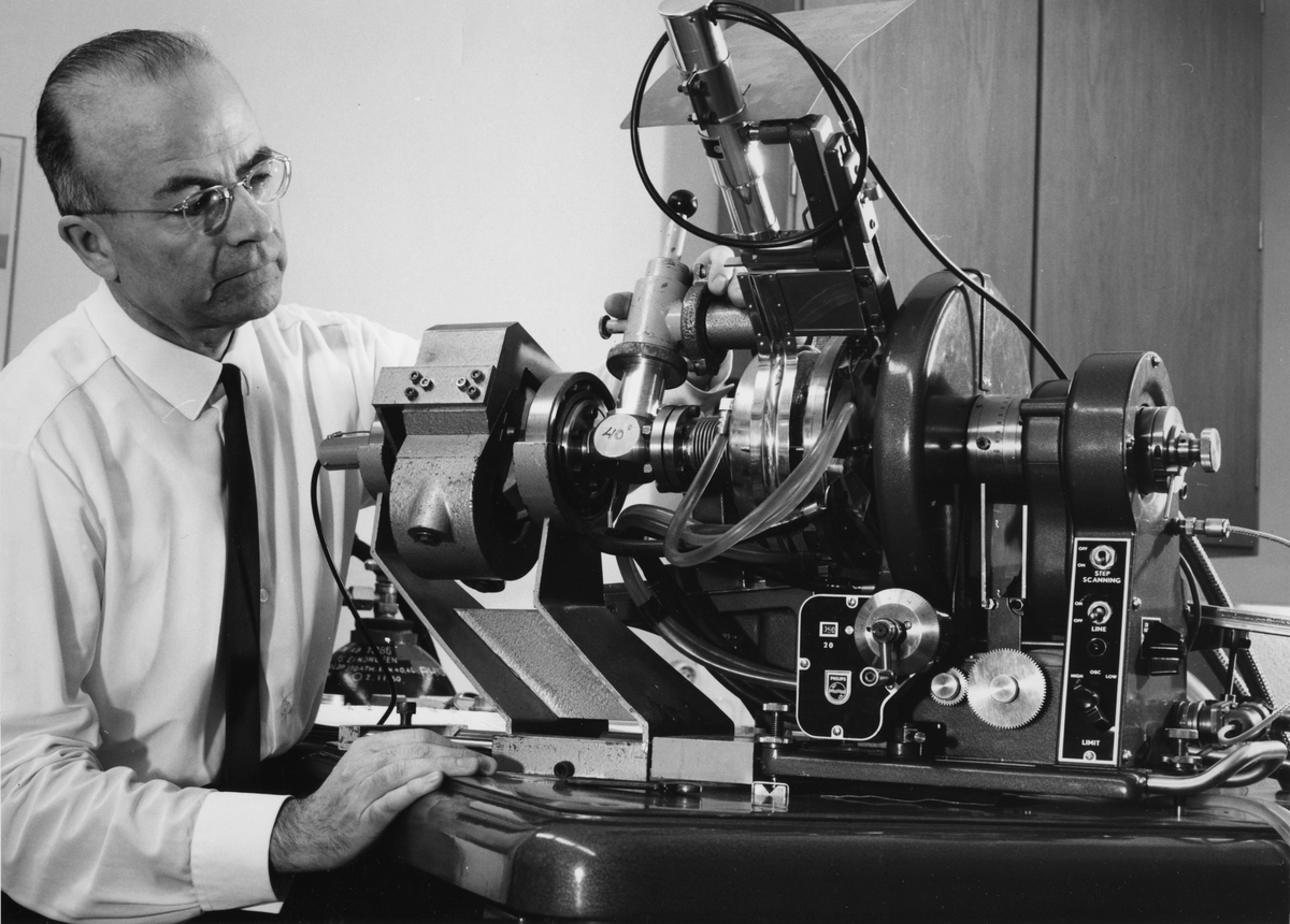 Sandvikens Järnverk (Sandvikens Jernverk). Apparatur för röntgenundersökning av stål. Här utför Sandvikens forskare grundläggande strukturundersökningar bland annat i utvecklingsarbetet för rostfritt rakklingstål.