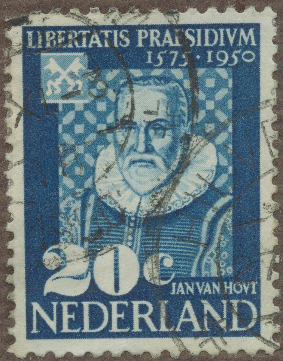 Frimärke från Nederländerna, 1950. Motiv av Jan van Hout En av styresmännen när universitetet i Leyden grundades 1575 375-årsjubileum 1950.