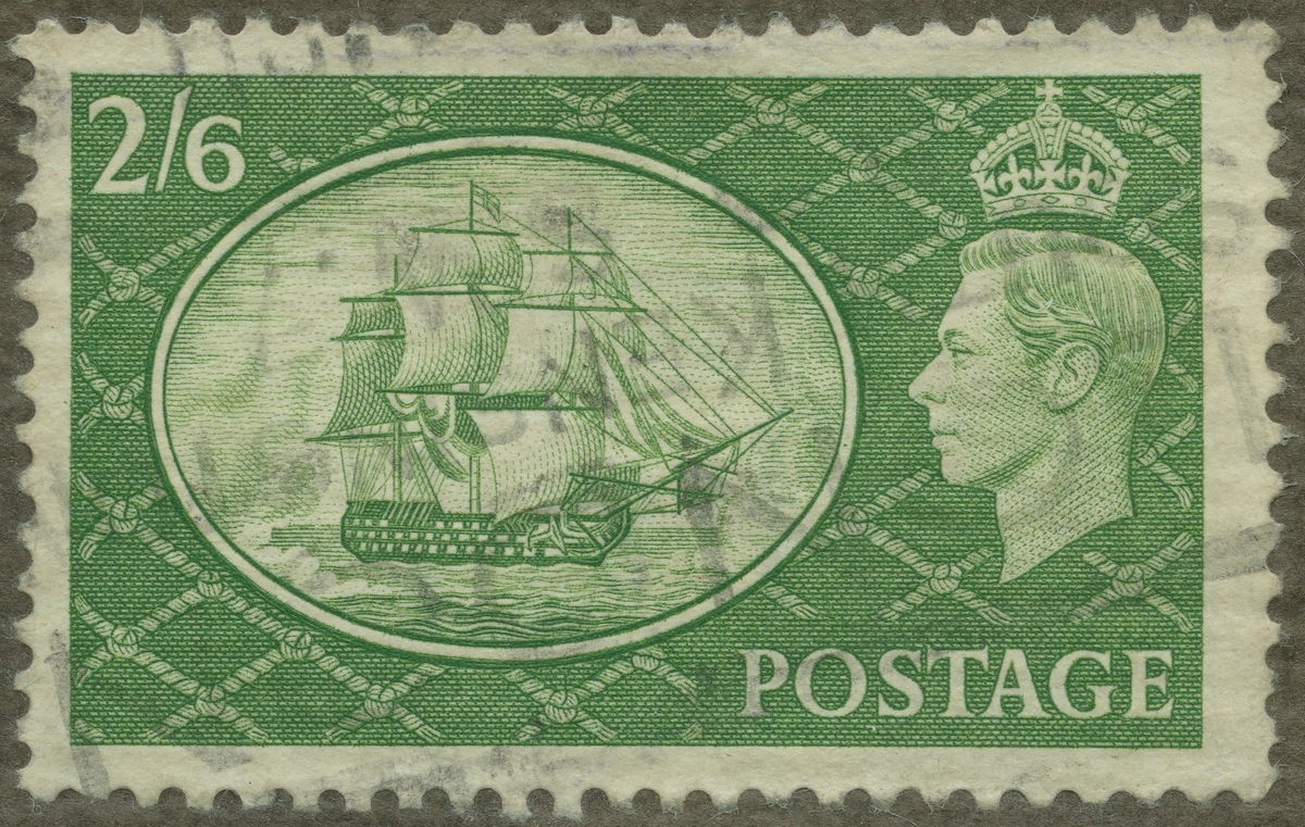 Frimärke från England, 1951. Motiv av Engelsk Fregatt H.M.S. Victory. (t.h.): -Kung George VI-