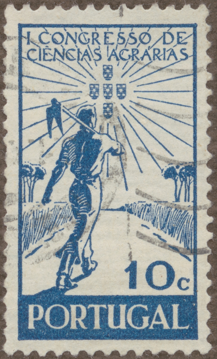 Frimärke från Portugal, 1943. Motiv av Portugisisk jordbruksarbetare med hacka 1. Lantbrukskongressen i Portugal