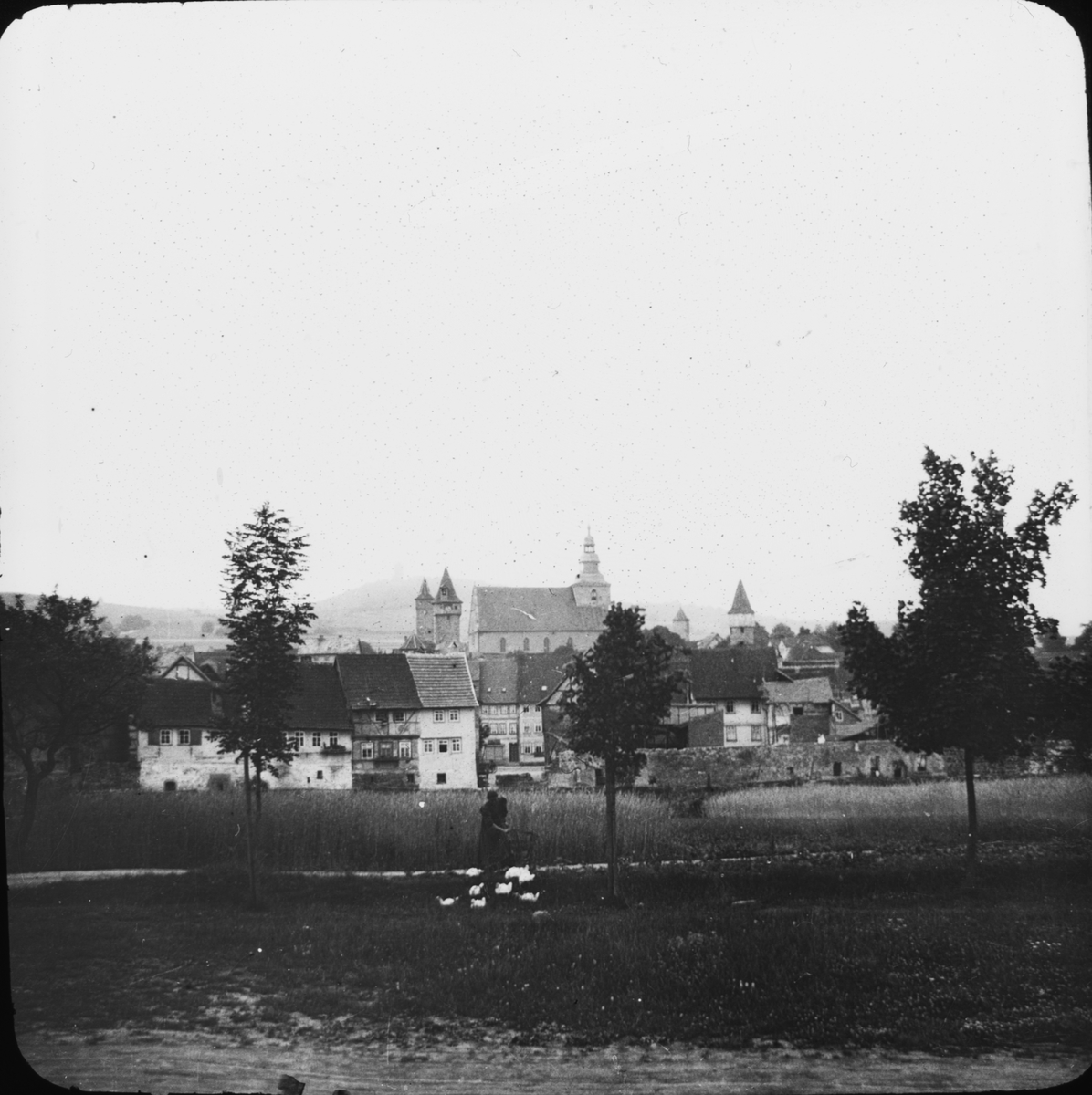 Skioptikonbild med motiv av vy över Fladungen. I förgrunden tjusande par som vaktar gäss.