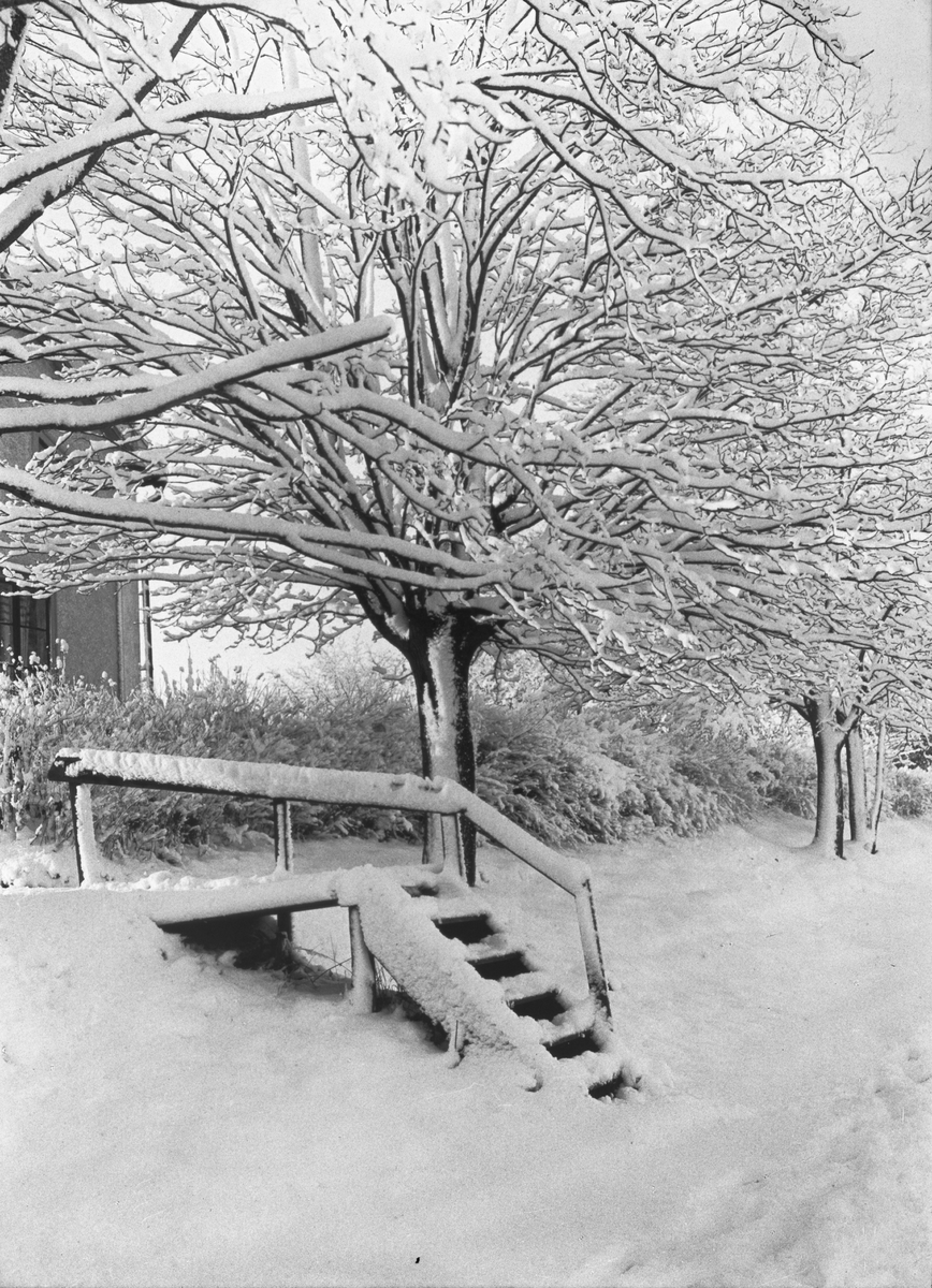 Diapositiv, fönster-bild med motiv av snötäckt trappa.