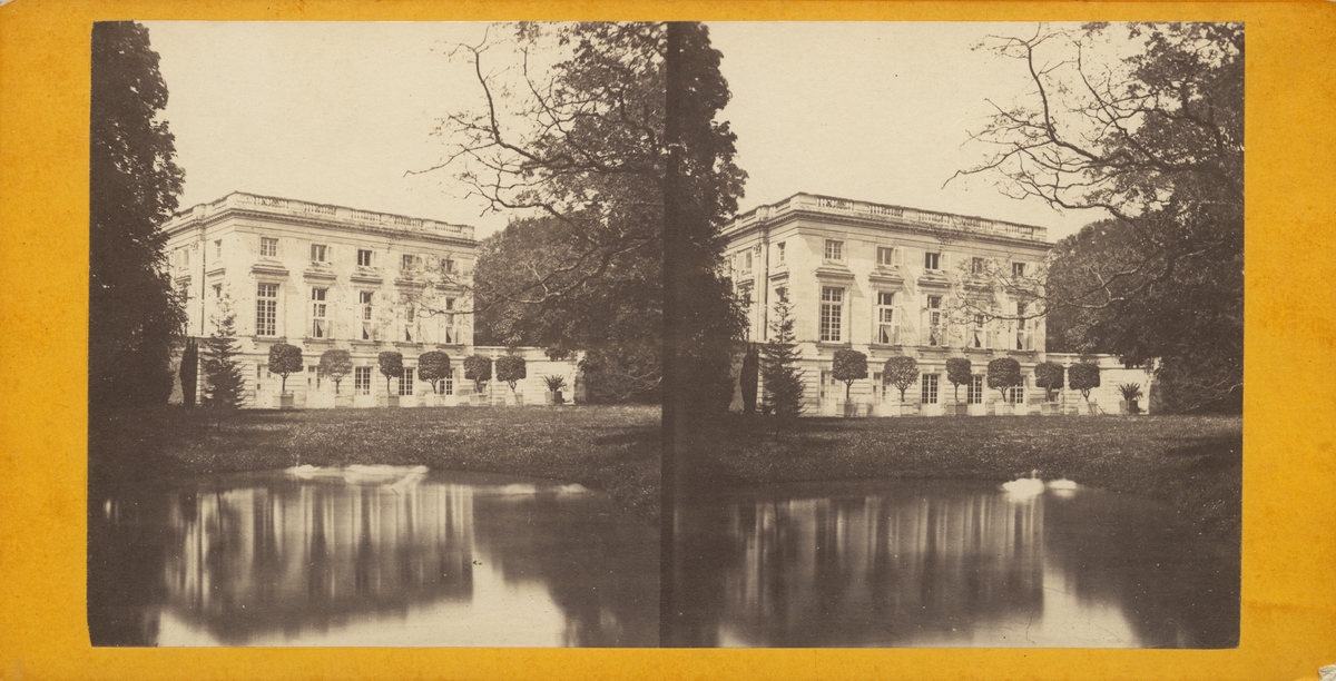 Stereobild med motiv av lustslottet Trianon, husfasad mot trädgård med damm.