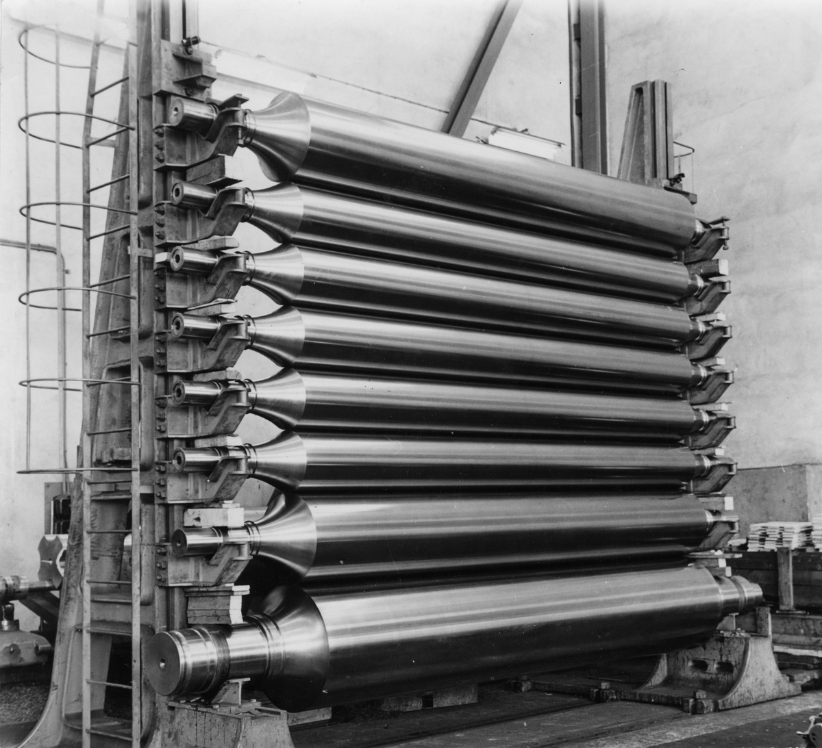 Kalandervalsstapel. Här är vissa valsar bomberande, det vill säga konvext slipade, för att ge kompensation för nedböjningen under arbetsbelastningen. Genom uppläggning i ett speciellt stativ och kontroll av ljustätheten i valsarnas anliggningsytor kontrolleras, att den beräknade och slipade bomberingen är riktig.