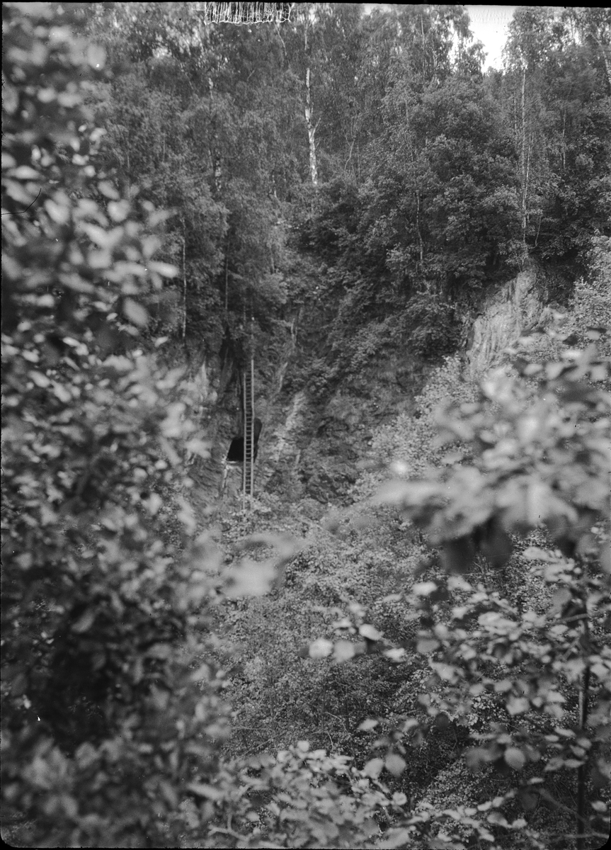 Järngruvor. Gammal gruvöppning (stöt) med ortgima och stegar i fonden.