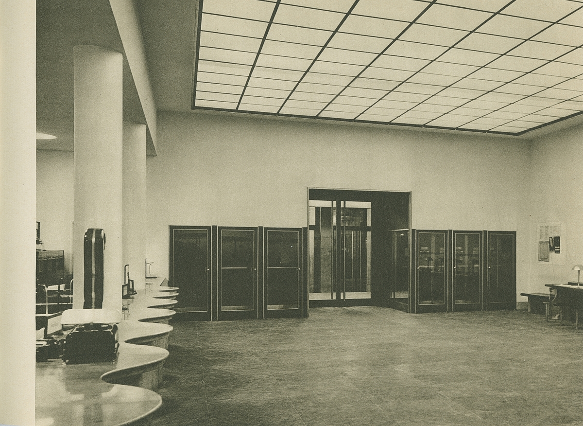 "Schalterhalle", "Postamt N 4, Berlin, Deutsche Reichspost, 72 Zonenspiegelleuchten J 240 g zu 200 watt".
