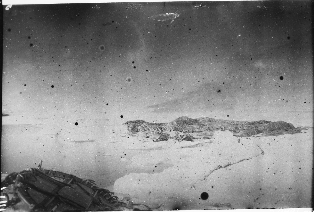 15 - 22 juli 1897. Den tömda ballongen och bärringen. Framtagning av bilderna gjordes av docent John Hertzberg år 1930 på Fotografi, Tekniska Högskolan.