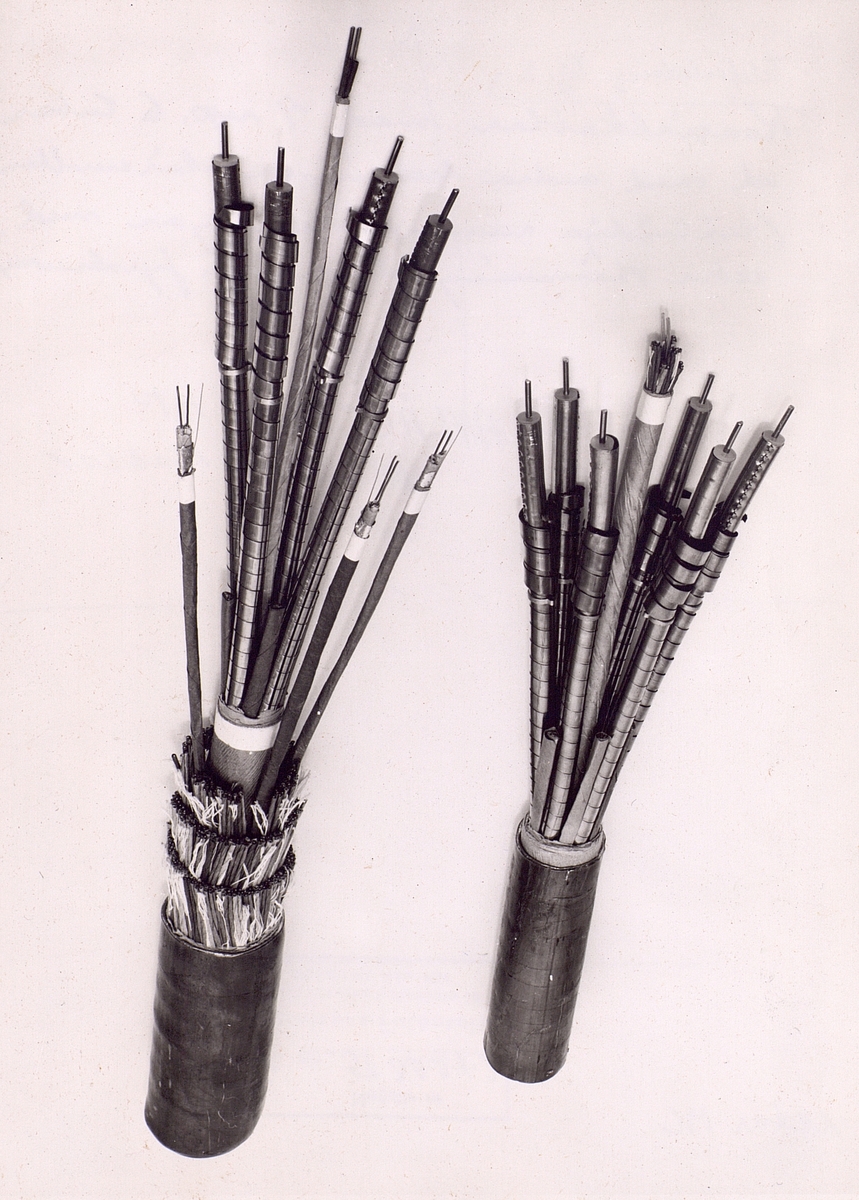 Koaxialkablar med 4 resp. 6 tuber och med andra ledningar däremellan (tvåtrådiga rundradioledningar med extra skärmning och vanliga fyrskruvar).
