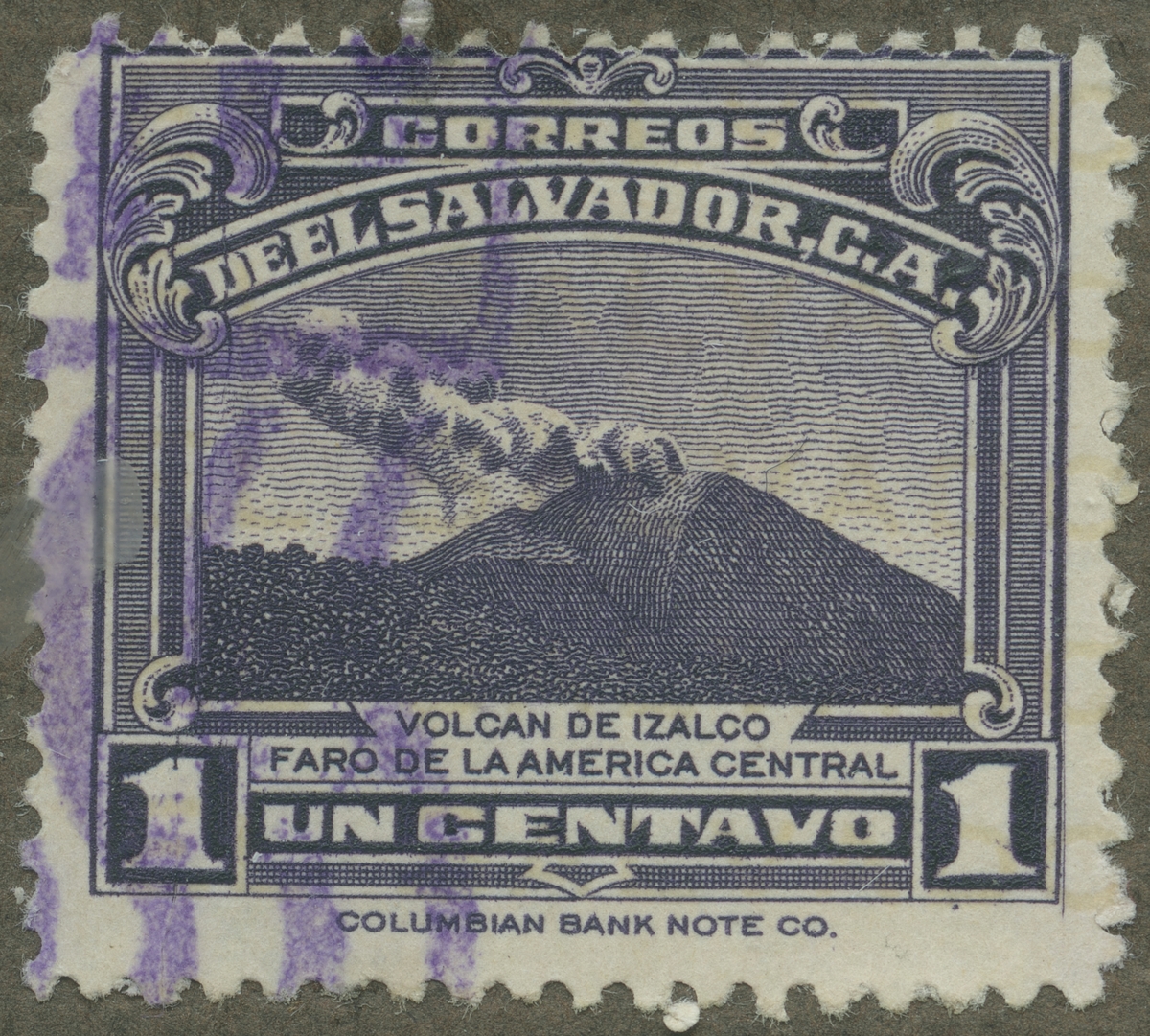 Frimärke ur Gösta Bodmans filatelistiska motivsamling, påbörjad 1950. Frimärke från Salvador, 1935. Motiv av Vulkanen Izalco "Centralamerikas fyr"
