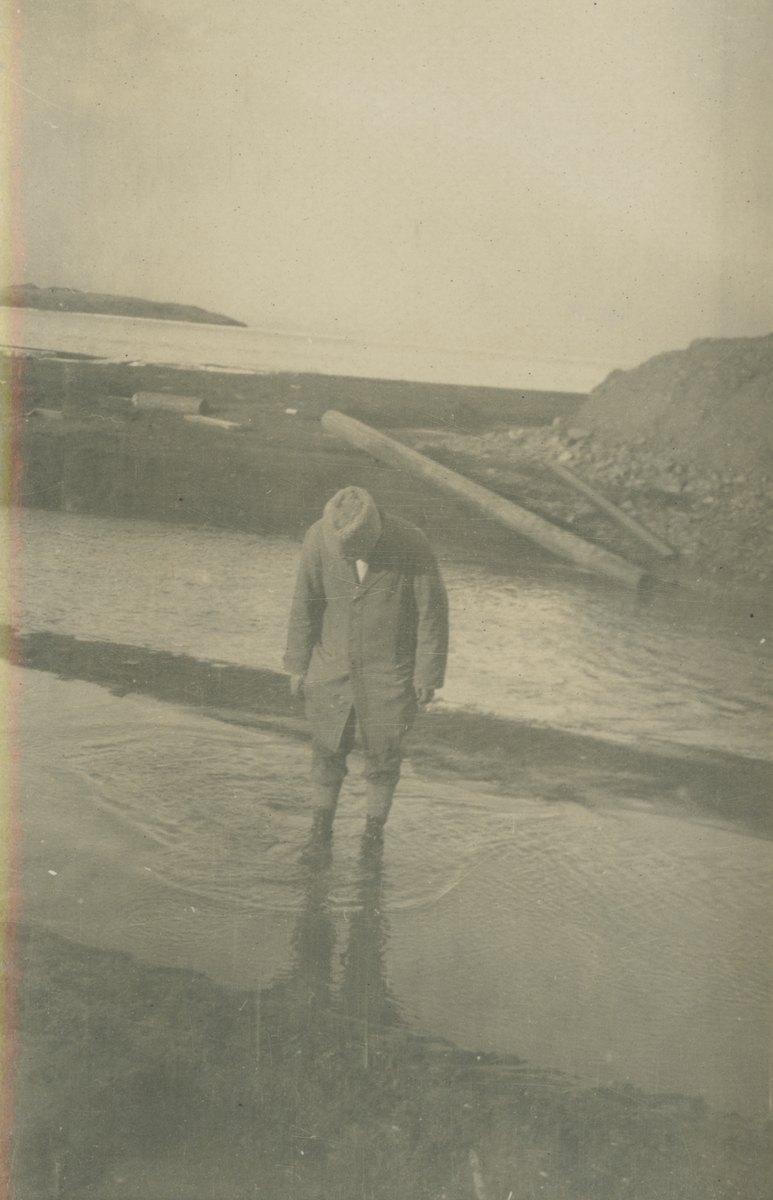 Fotografi från expedition till Spetsbergen. Motiv av man som står i grunt vatten.