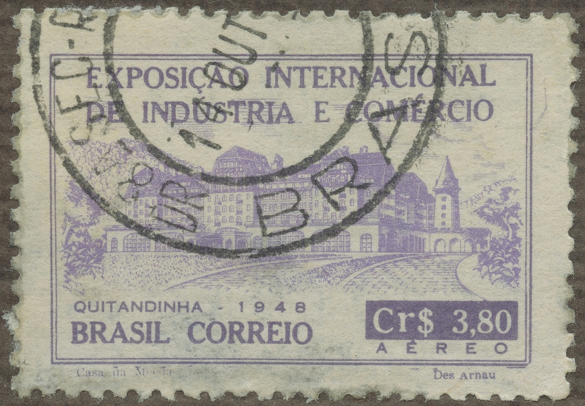 Frimärke från Brasilien, 1948. Motiv av Internationell Industriutställning i Quitandhina 1948