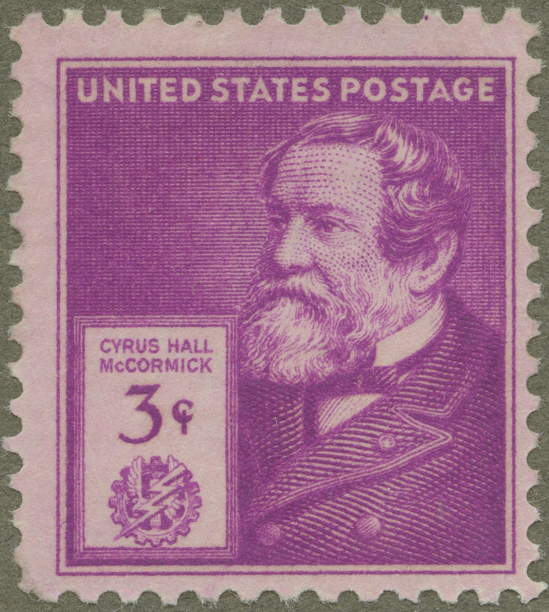 Frimärke från USA, 1940. Motiv av Cyrus Hall Mc Cormick 1809-1884. Amerikansk uppfinnare. Skördemaskin 1837. Stor fabrik i Chicago för lantbruksmaskiner.