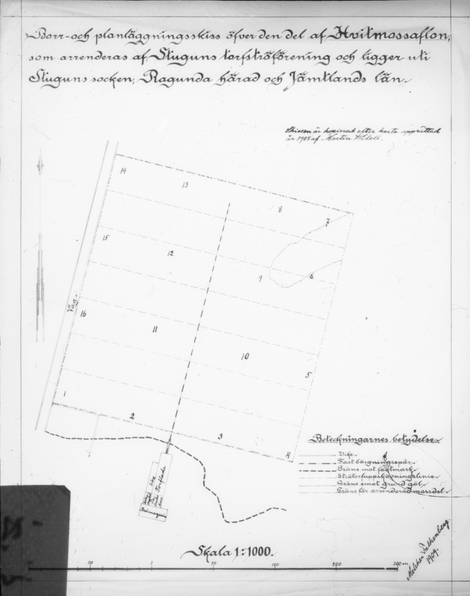Skioptikonbild. Borr- och planläggningsskiss öfver Hvitmossaflon som arrenderas av Stuguns torfströförening och ligger uti Stuguns socken, Ragunda härad och Jämtlands län.