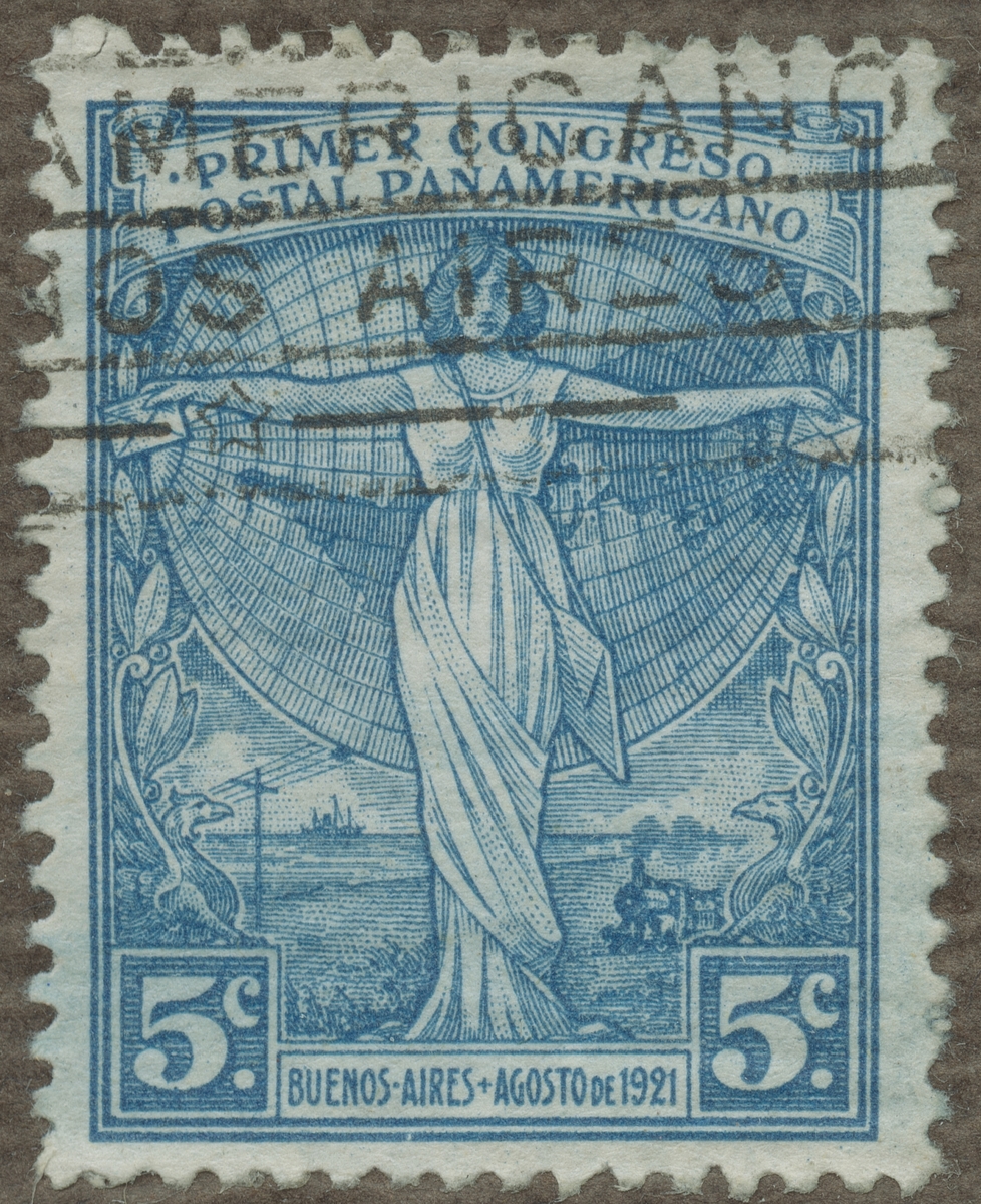 Frimärke från Argentina, 1921. Motiv av Kvinnosymbol framför västra halvklotet Första Panamerikanska kongressen 1921