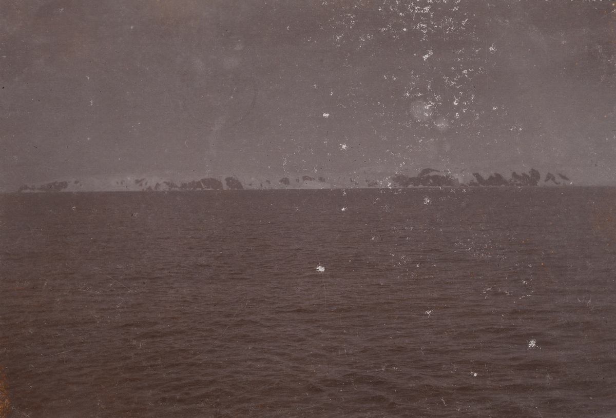 Titel: Fotografi från första svenska Antarktisexpeditionen 1901-1904. Vy över hav och snötäckta berg.