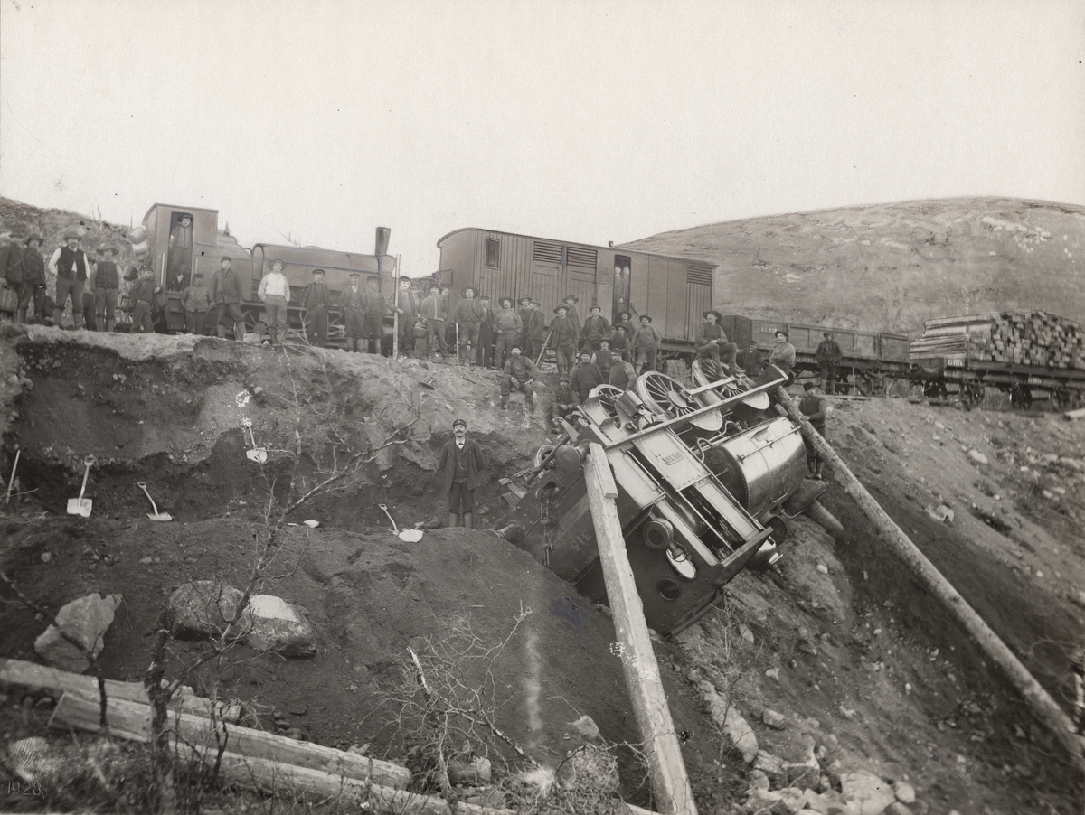 Från Riksgränsbanans bygge: "Duvan" med "benen" i vädret vid 46:an (mellan Bergfors och Torneträsk) 10 meter utför gruvvall???????. Efter att ha satts på "rätt köl" gick den för egen maskin ned till Boden för att repareras.