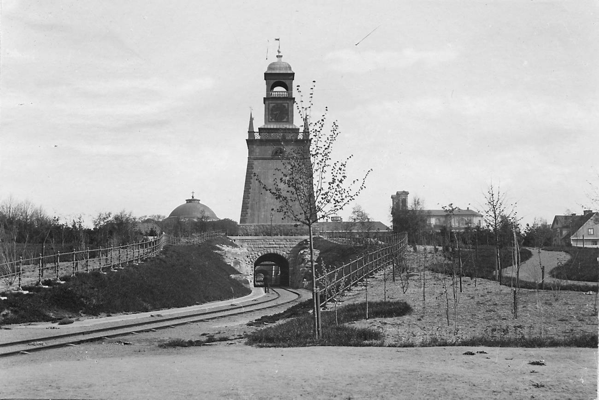 Järnvägstunnel i Karlskrona 1904. I fonden syns Klockstapeln. Bild från tidskriften Hemmets bildmaterial.