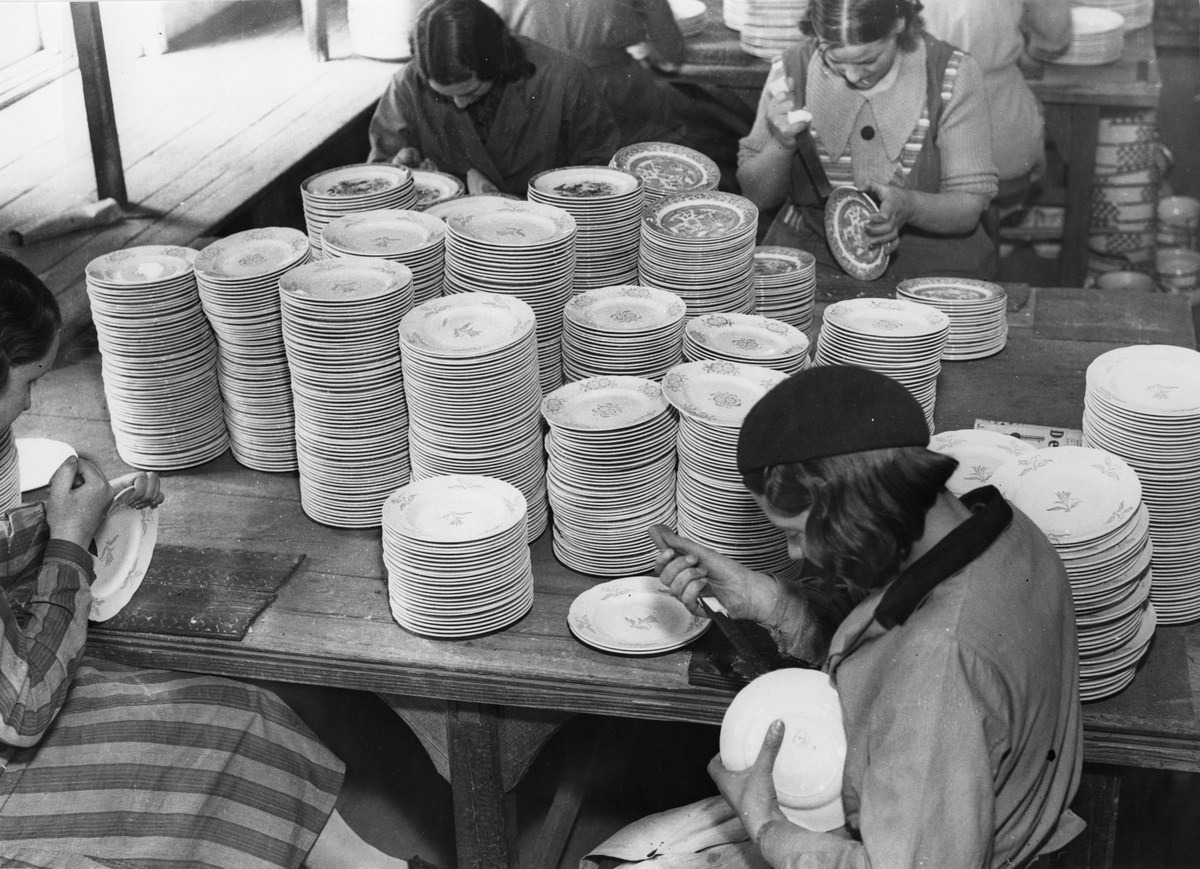 Gustavsbergs Porslinsfabrik. Slipning av fat för hand.