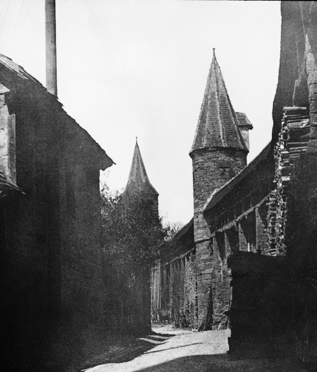 Skioptikonbild med motiv av stadsmuren med vaktgång, i Rothenburg.