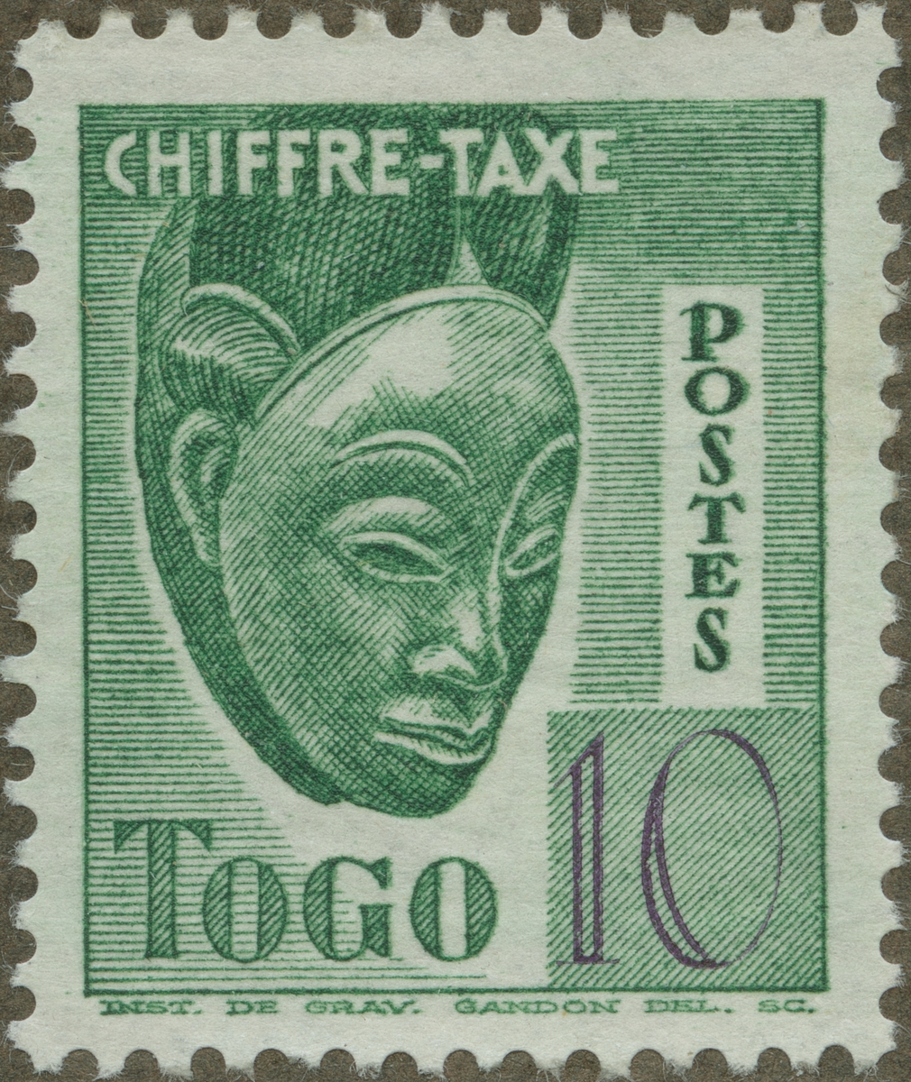 Frimärke från Franska Togo, 1940. Motiv av Afrikansk konst Mask Franska Togo Västafrika