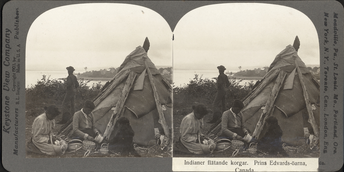 Stereobild av indiankvinnor vilka flätar korgar framför tält, Prins Edwards-örarna, Canada.