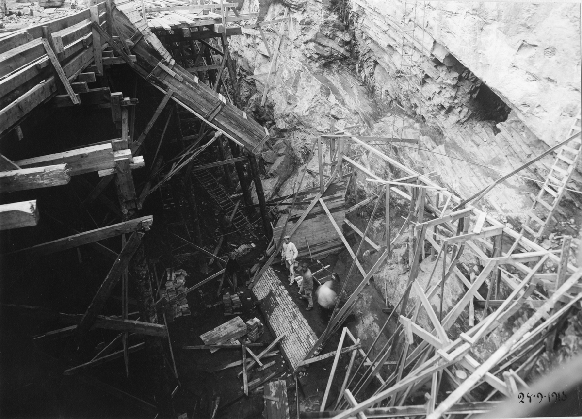 Ombyggnad av Trollhätte kanal, Trollhättan. Norra sidan med kryplan i övre portkammaren i sluss nummer fem.