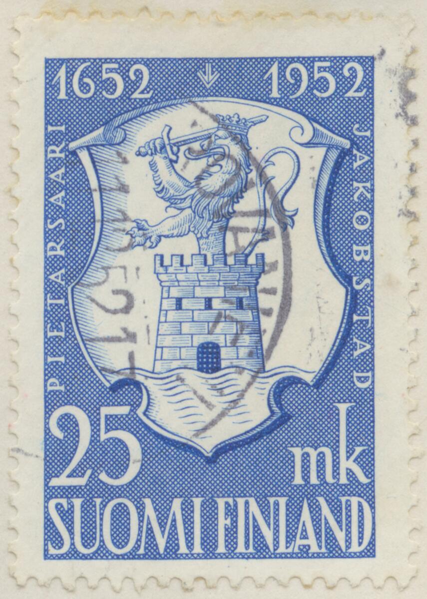 Frimärke från Finland, 1952. Motiv av Jakobstads Vapen 300-årsminne av staden Pietarsaari:s grundläggning (Jakobstad) 1652-1952.