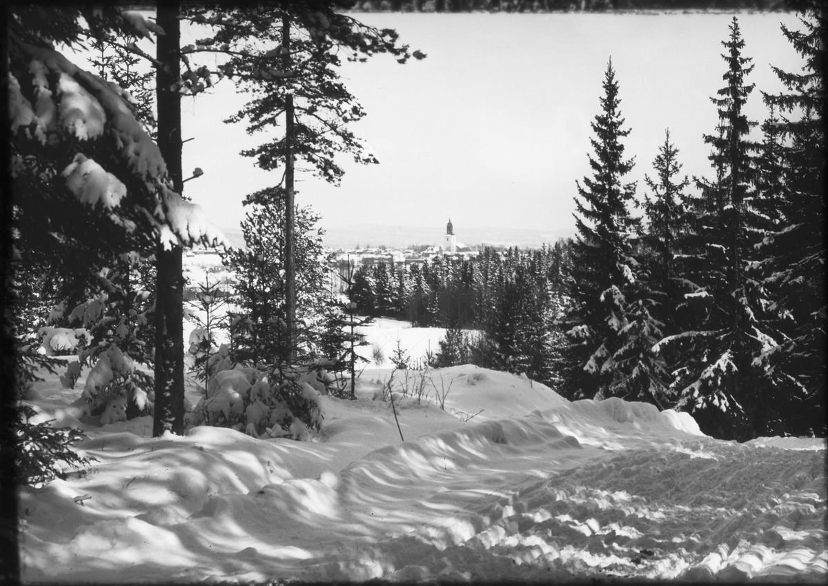 Diapostiv, fönsterbild med motiv från Hedemora. Snötäckt skogsväg med Hedemora kyrka i bakgrunden.