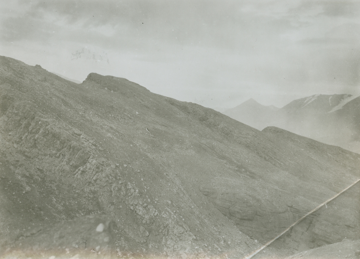 Fotografi från expedition till Östgrönland 1929. Dansk-svensk expedition under ledning av Lauge Koch. Svenska deltagare: Oscar Kulling och Helge Backlund. Vy över kargt bergslandskap och molnig himmel.