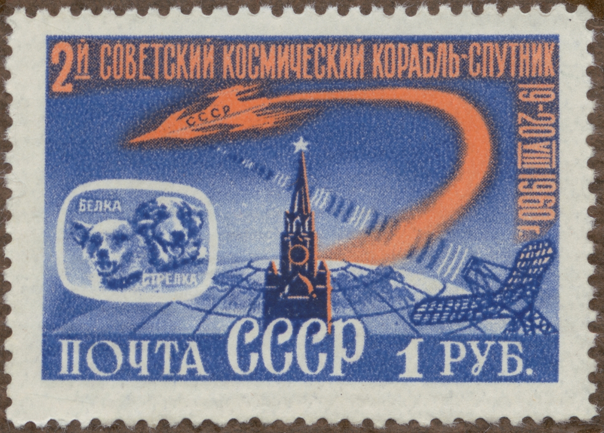 Frimärke från Ryssland, 1960. Motiv av Rymdhundarna Belka och Strelka passagerare på Sovjetrymdskeppet Sputnik II 19-20 augusti 1960