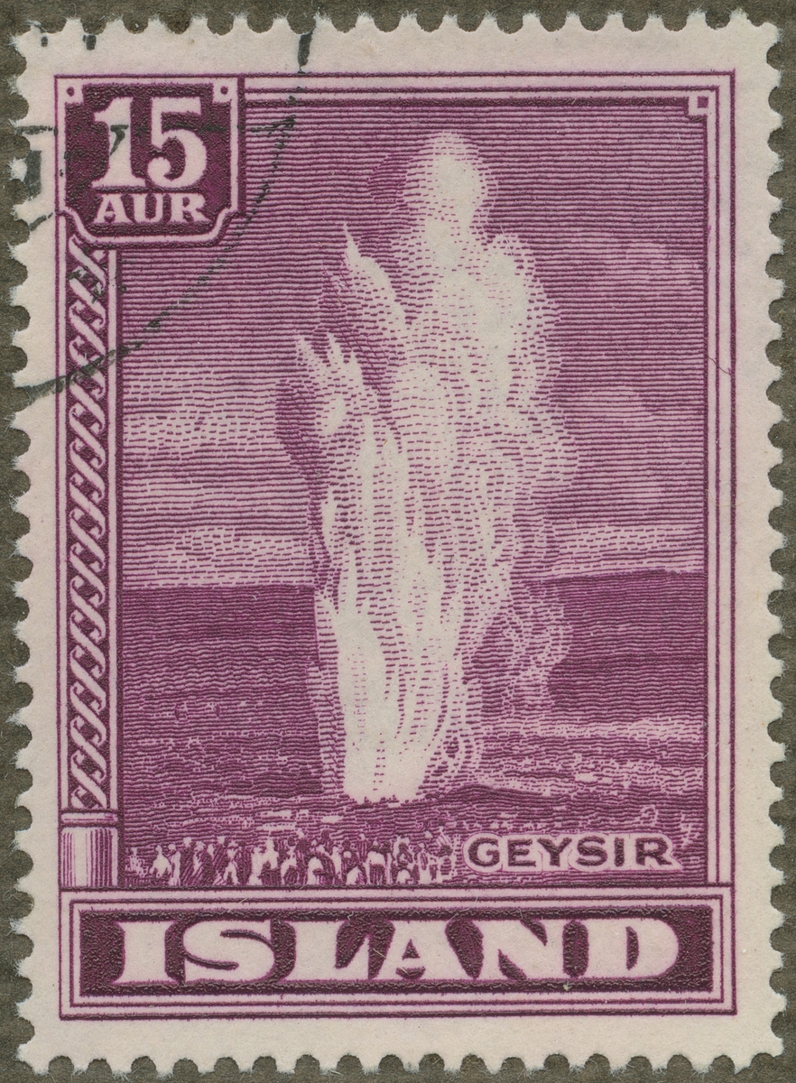 Frimärke ur Gösta Bodmans filatelistiska motivsamling, påbörjad 1950. Frimärke från Island, 1938. Frimärke med motiv av Geyser - utbrott på Island
