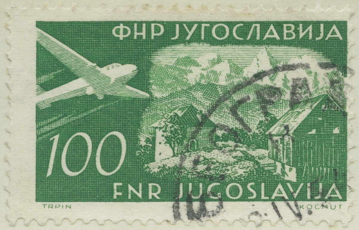 Frimärke ur Gösta Bodmans filatelistiska motivsamling, påbörjad 1950. Frimärke från Jugoslavien, 1951. Motiv av Jugoslaviskt Fjällandskap "Monoplan"