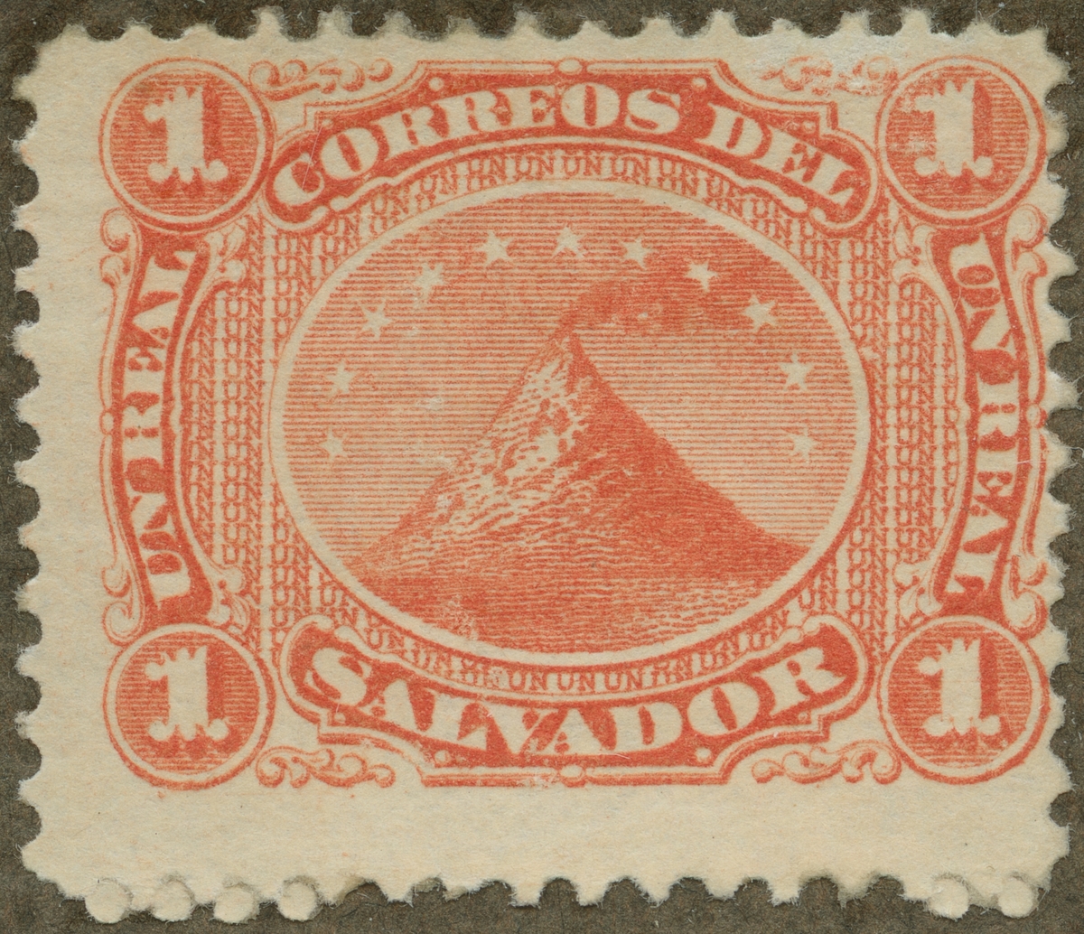 Frimärke ur Gösta Bodmans filatelistiska motivsamling, påbörjad 1950. Frimärke från San Salvador, 1867. Motiv av Vulkanen "San Miguel" Salvador