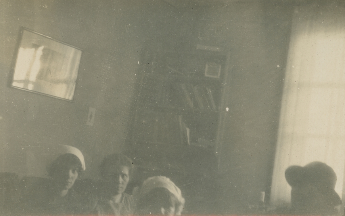 Fotografi från expedition till Spetsbergen. Motiv av fyra kvinnor som umgås inomhus. På bilden syns en bokhylla full med böcker, en tavla och en gardin.