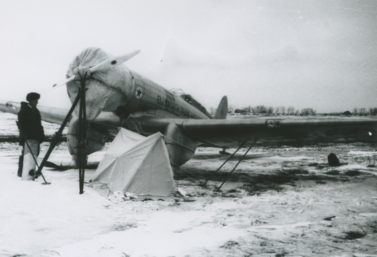 Fotografi från låda märkt Bernt Balchen. Balchen var norsk-amerikansk flygare, polarforskare och militär. Motiv av man och flygplan i snötäckt landskap.