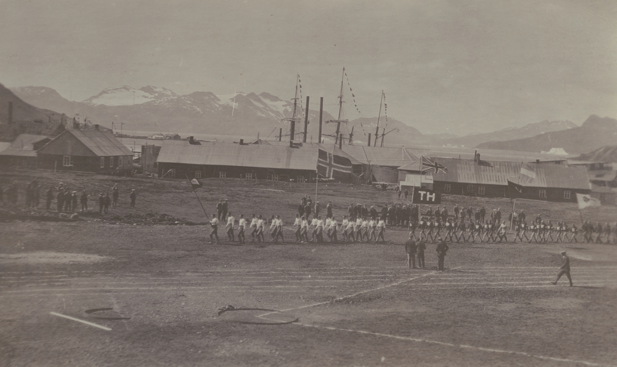 Bild från expedition i Antarktisområdet. Motiv av män med flaggor i Grytviken, 1928.