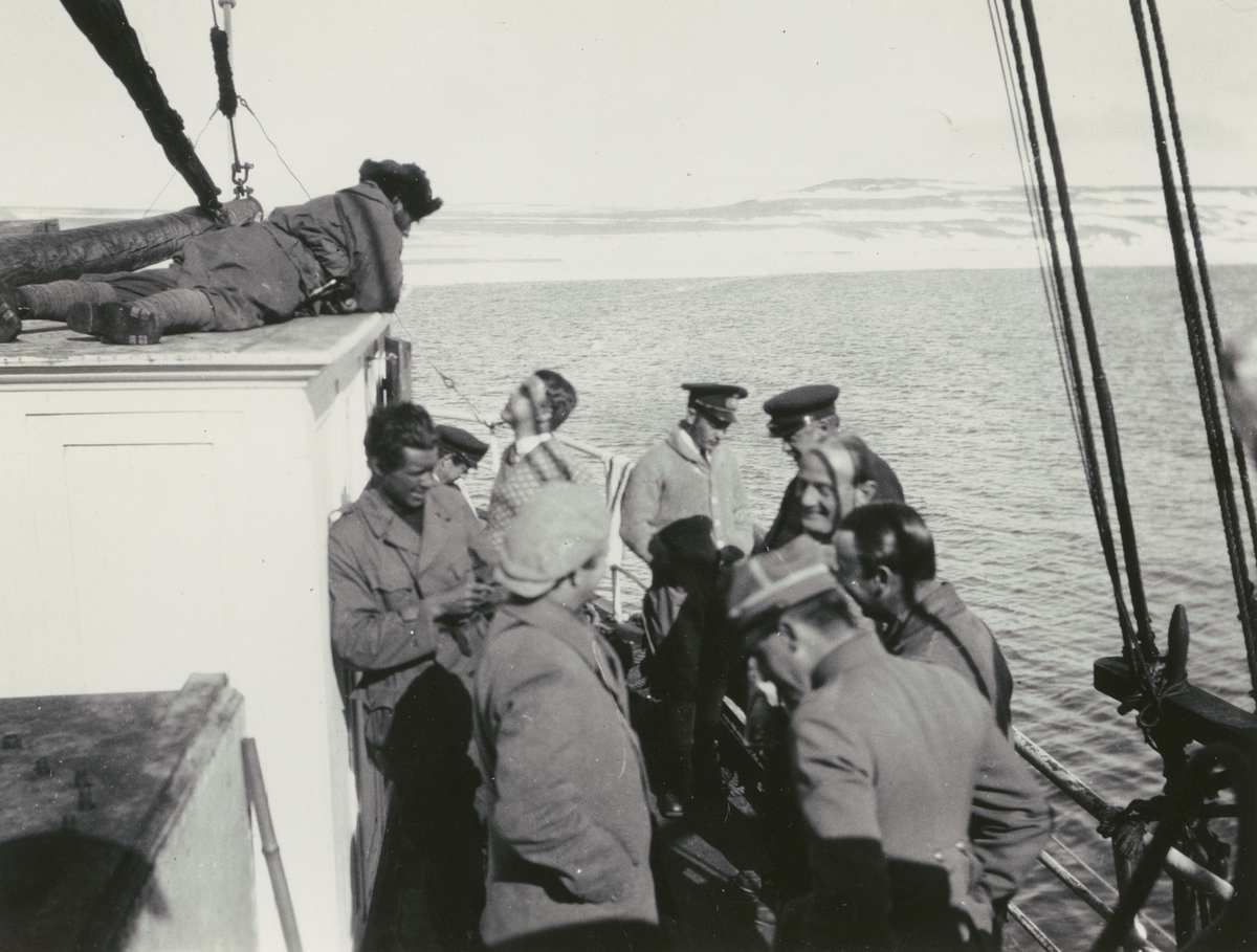 Fotografi från svenska undsättningsexpeditionen 1928. Motiv av en grupp män ombord på fratyget "Quest".