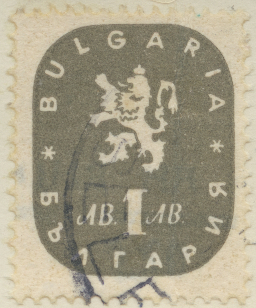Titel: Frimärke ur Gösta Bodmans filatelistiska motivsamling, påbörjad 1950. Frimärke från Bulgarien, 1945. Motiv av Vapen Lejon