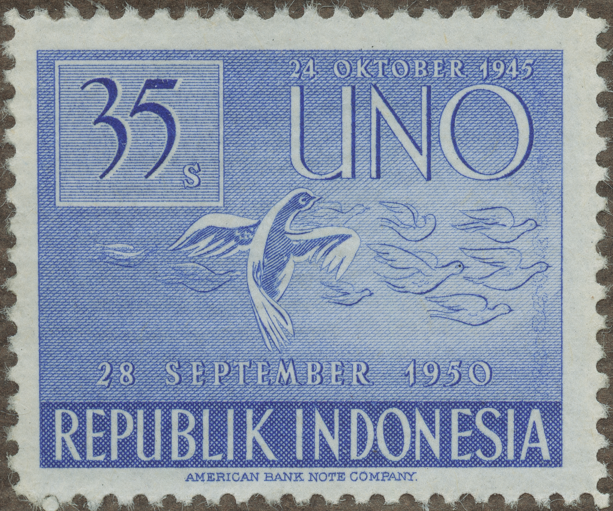 Frimärke från Indonesien, 1951. Motiv av Duvor: symbol för freden 6-årsminne av FN:s stiftelse 24 oktober 1945. -1-årsminne av Indonesiens medlemskap i FN: 28 september, 1950.